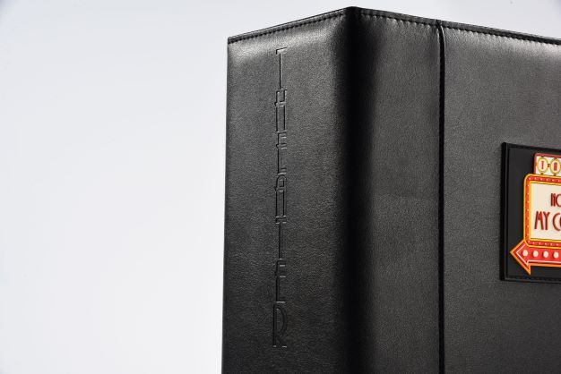 Imagine your theater fan friends go on a casual visit to your home, while you’re chatting they take a look at your bookshelf and spot a bright black leather folder with a word engraved on the spine “THEATER” they can read from the distance, followed by a number 1 on a billboard-like panel sewn on it, insinuating this is the first of a very unique collection. They ask for your permission to approach what has just stolen their attention and have a look, you nod in a signal of approval, and as soon as you can tell they’re pulling the folder out of the shelf… You can see their shiny eyes when reading the logo on the cover, “Now showing my collection” they whisper while hurrying to flip the cover… You got’em!